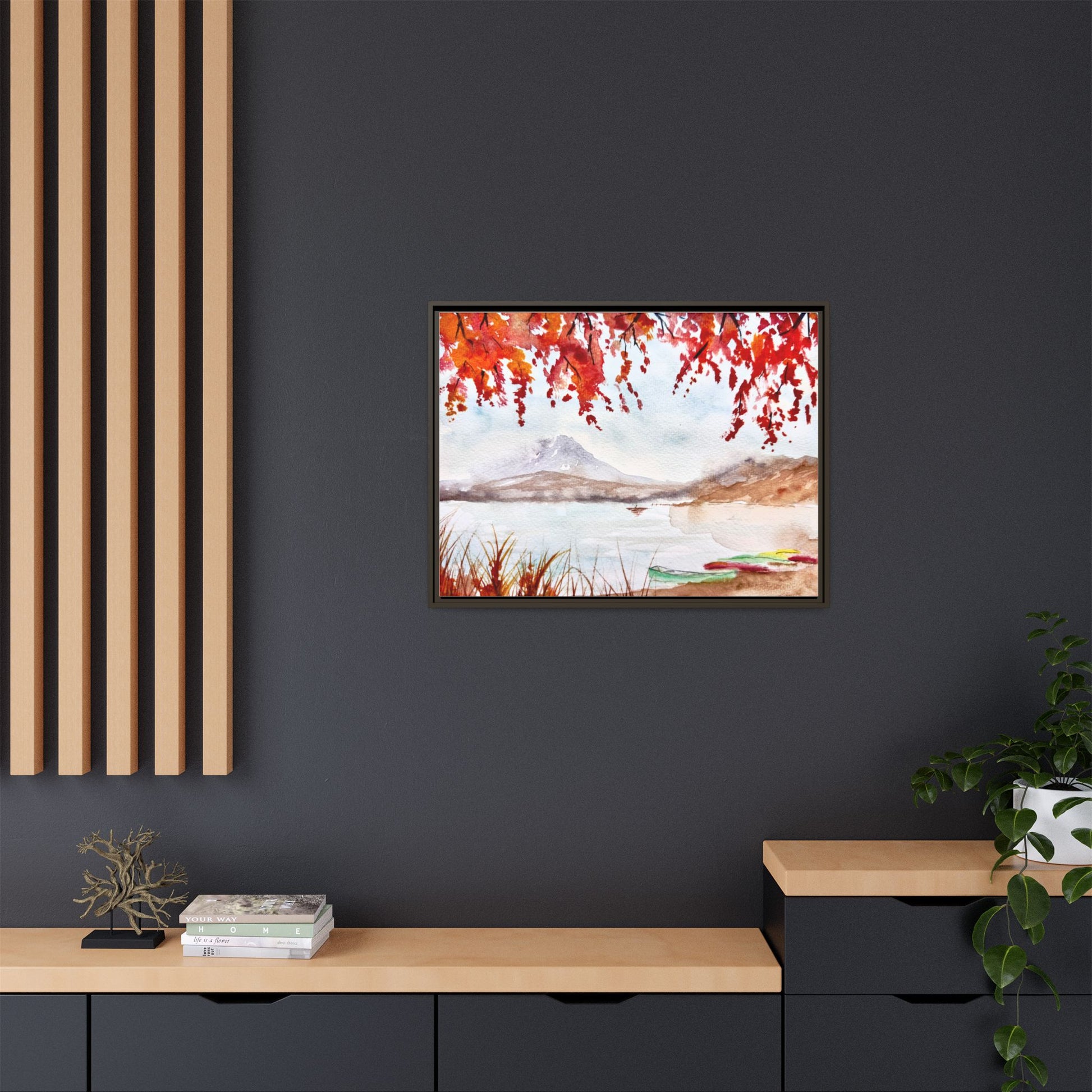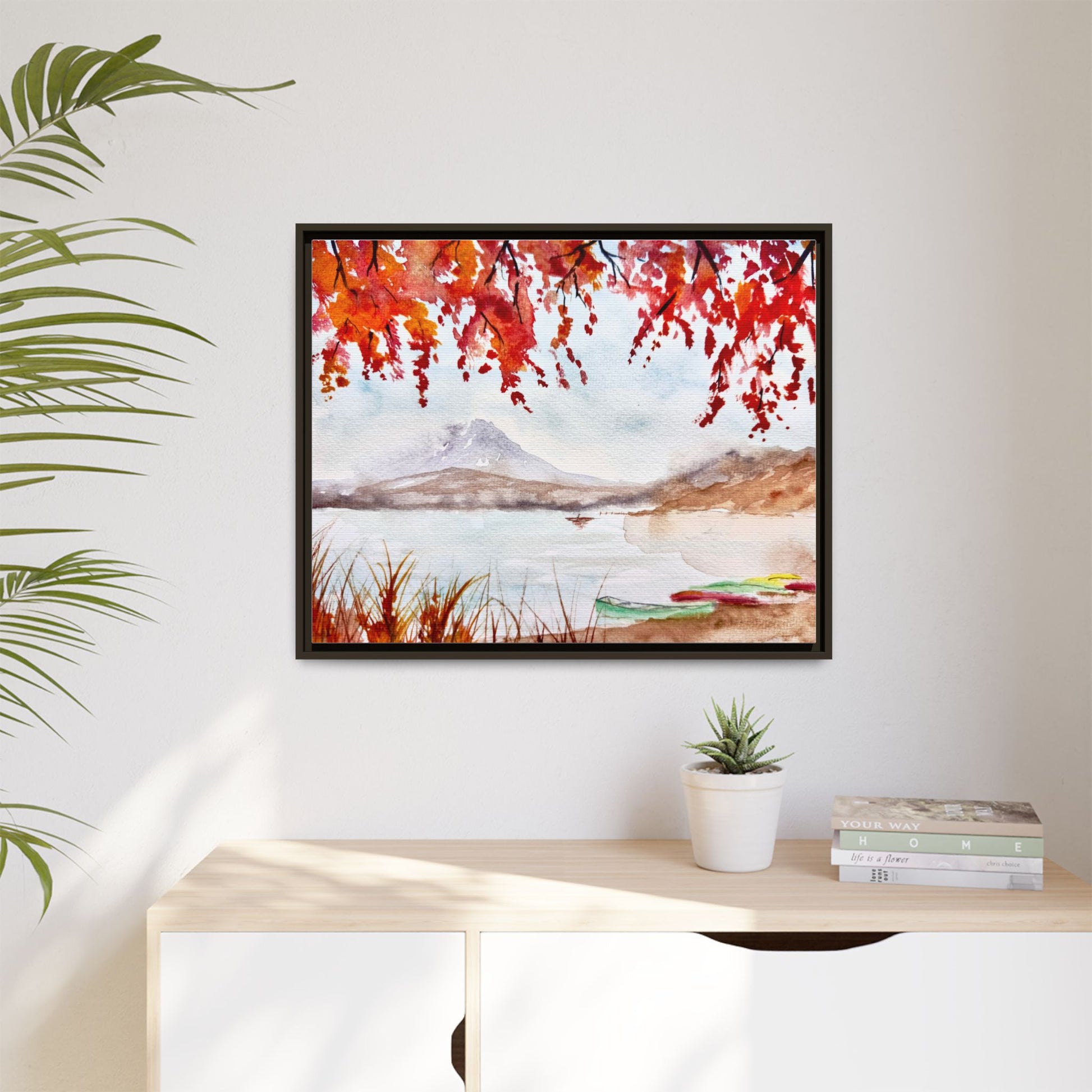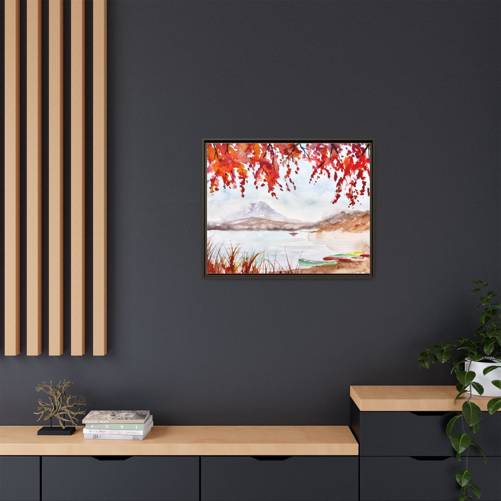 Mount Fuji sits majestically in the distance, framed by brilliant fall foliage in Kyle's serene watercolor print. A magnificent sight to handsomely adorn any space, this framed matte canvas print would be an exceptional gift, especially for lovers of Japanese themed decor.