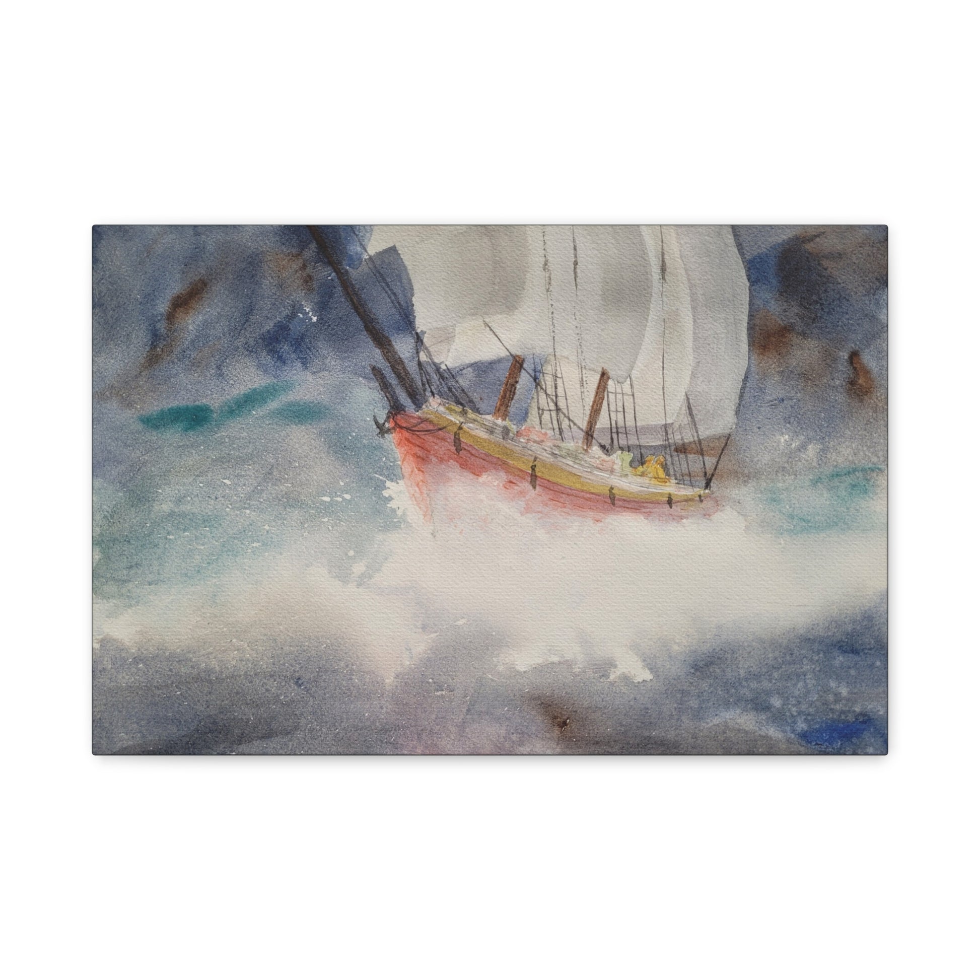 Two brave mariners, caught in a sudden squall, hold on tightly as they navigate the maelstrom of rough seas. Kyle's watercolor print on canvas will bring stunning drama to any home decor and also makes an excellent gift exemplifying the weathering of life’s storms.