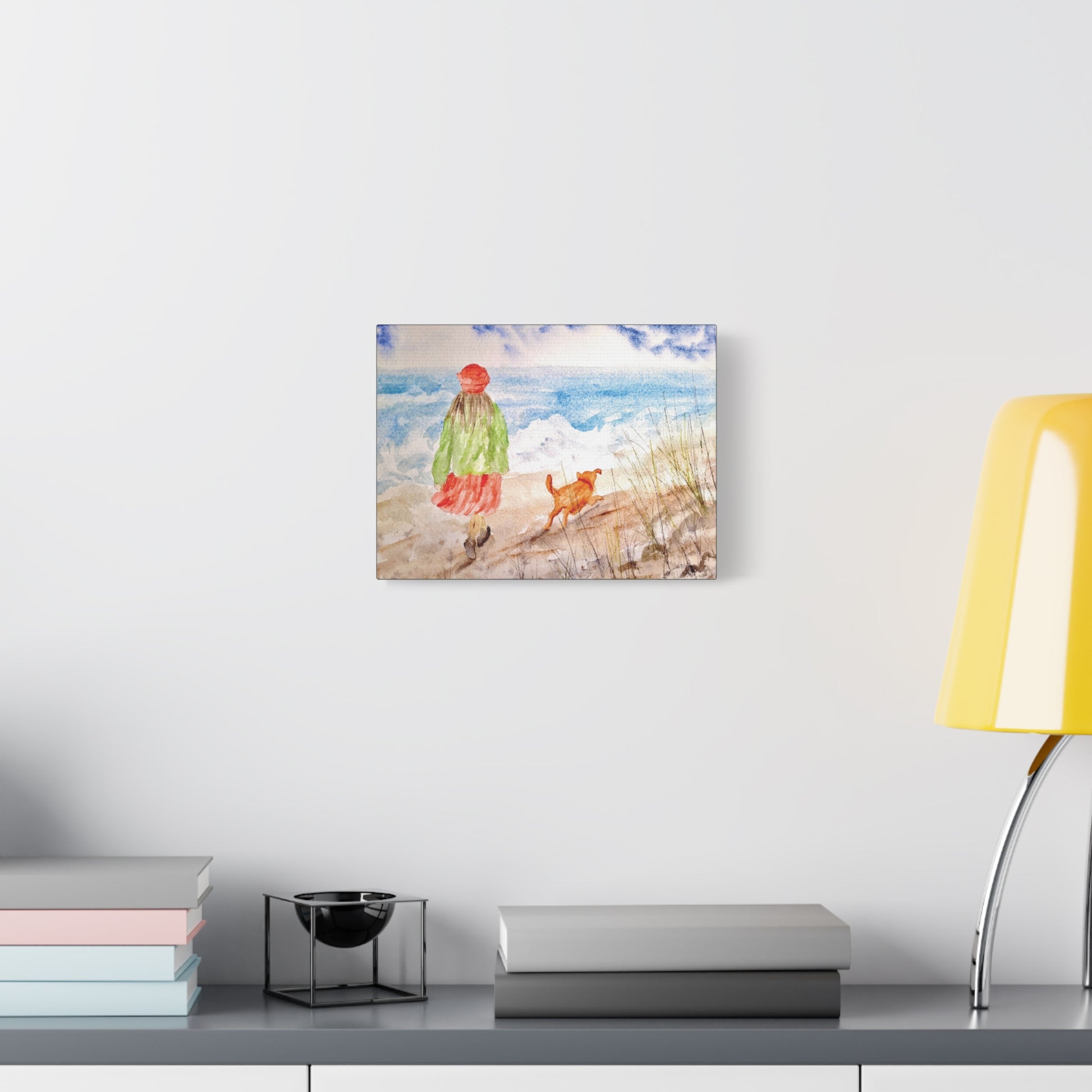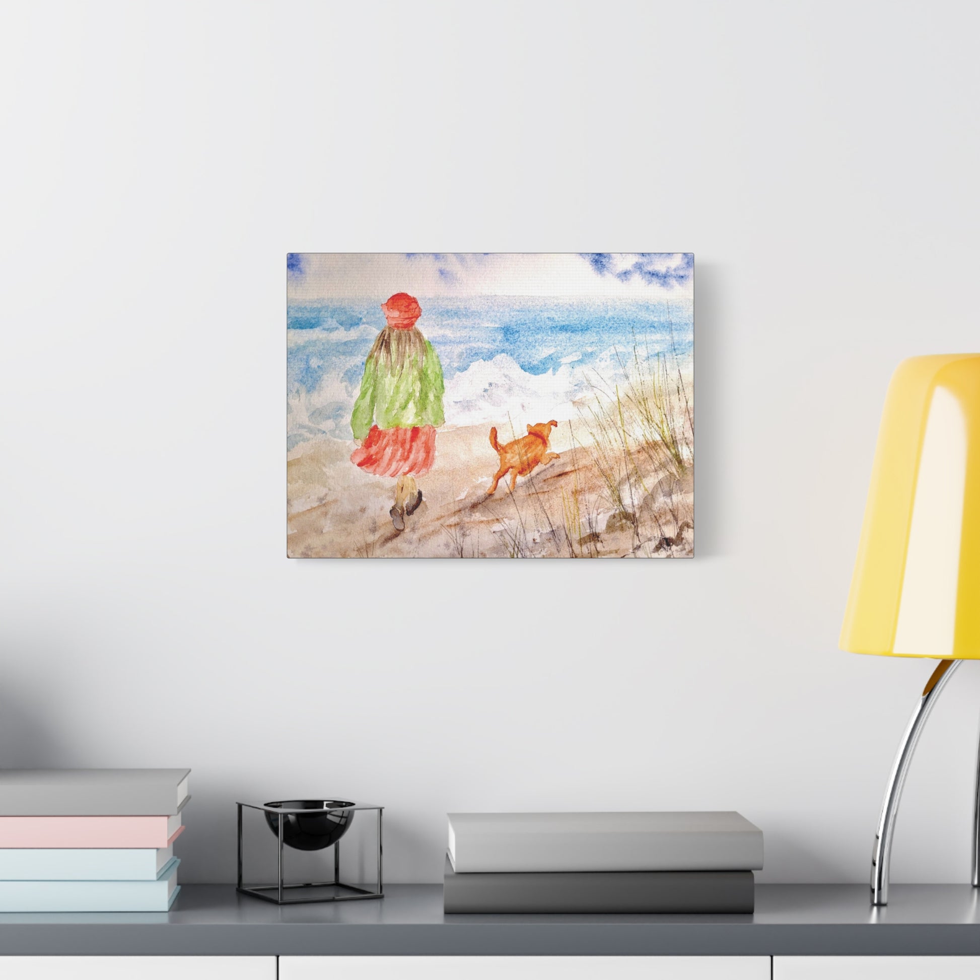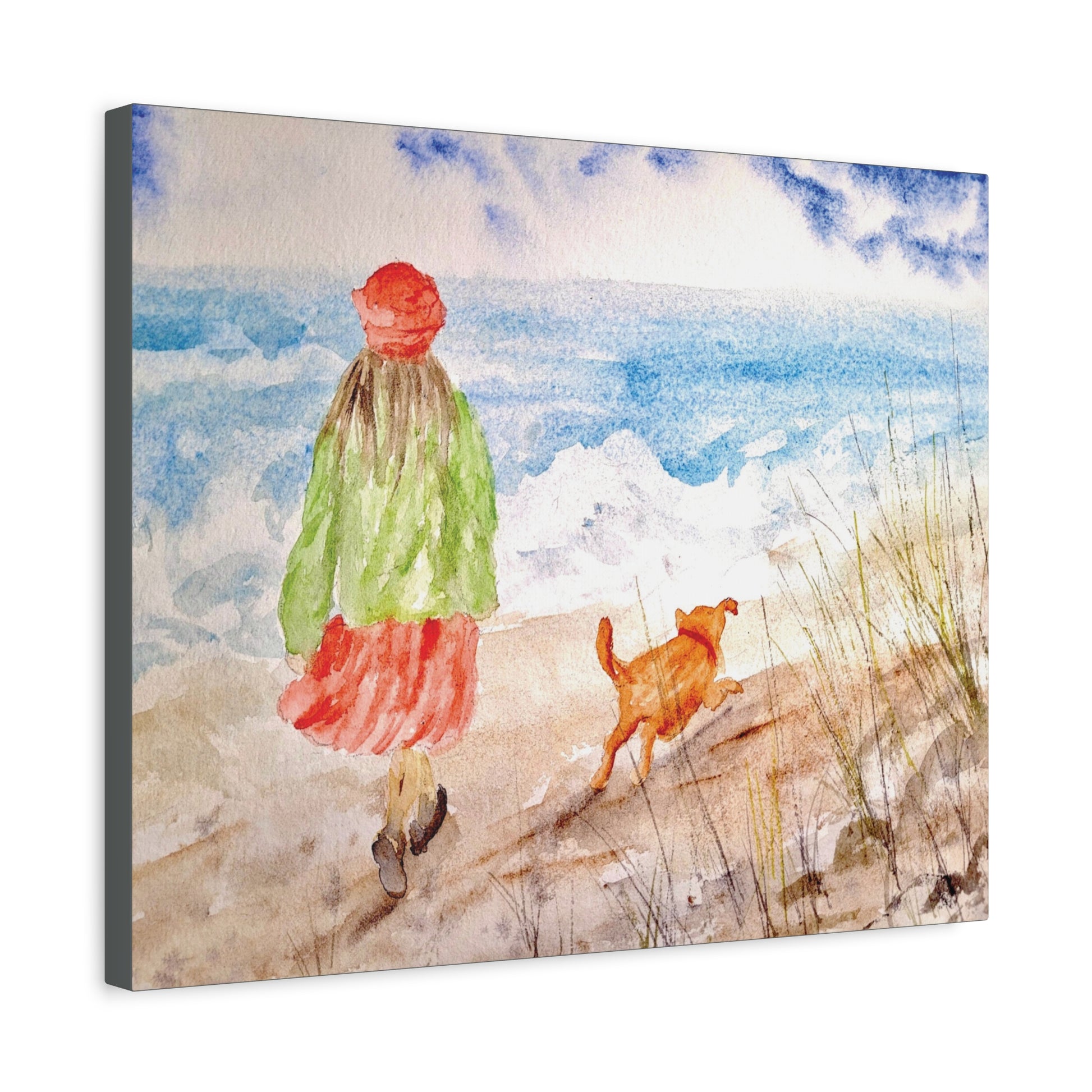 Seaside adventure with her best friend is on the mind of this young beachcomber—the brisk winds rousing them toward discovery. Kyle's delightful watercolor print on canvas evokes exploration as waves crash upon the shore. This matte canvas would be an exceptional addition to any home decor and makes an excellent and timeless gift for any occasion.