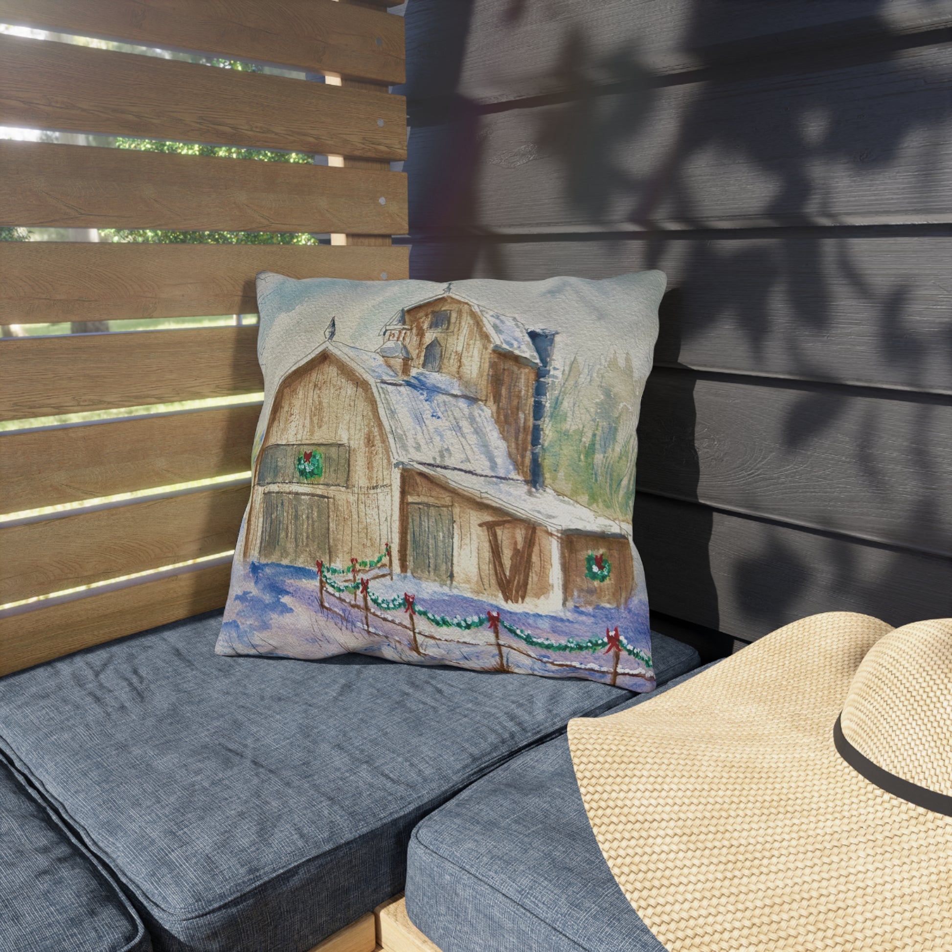 This festive pillow brings a touch of the holiday season to any decor-- indoor or out. Kyle's watercolor of a barn amidst snow covered fields and Yuletide trimmings will surely bring the spirit of celebration to your home.