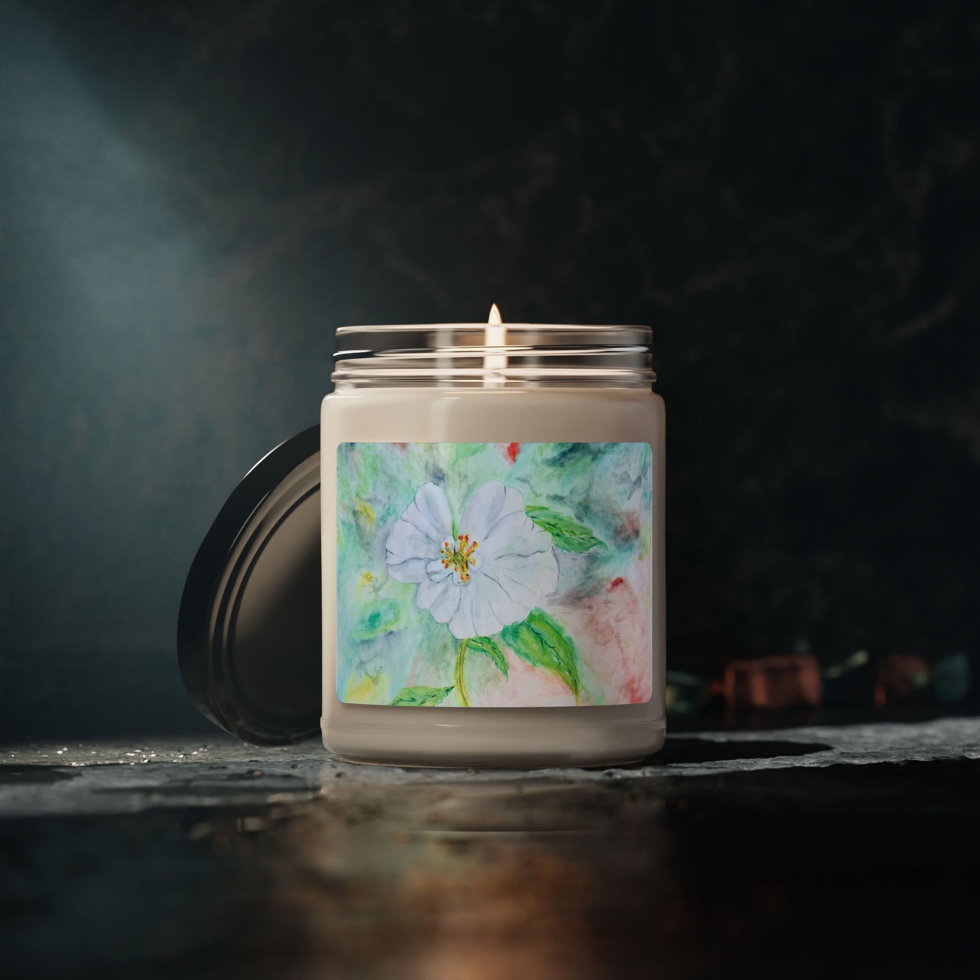Eco-Friendly Soy Candle (9 oz.), Featuring Delicate Watercolor White Flower. Multiple Scents Available.